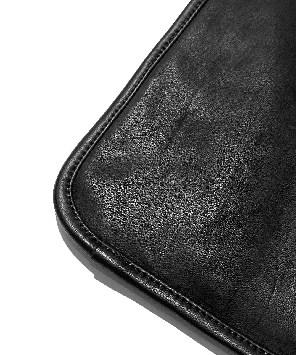 表のレザーは”Mustang”にも使われている厚手のホースレザー、裏面には3ミリ厚の耐熱フェルトを使った2重構造です。厚みのあるしっかりとした生地で熱ダメージや擦れを軽減。